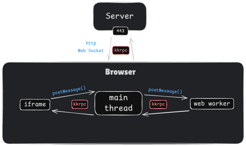 This is how kkrpc works in browser between iframe, main thread, web worker and server.
